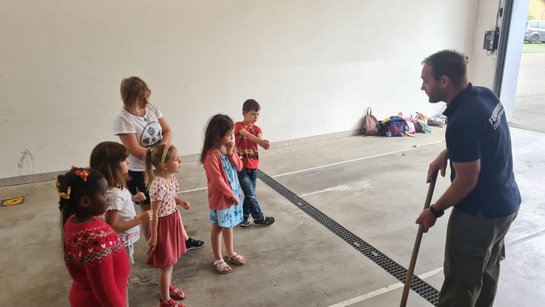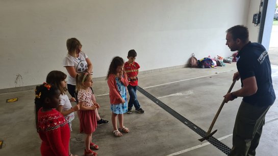 Danach haben wir den Kindern die Feuerwehrautos und deren Beladung erklÀrt, wobei auch das Spritzen mit dem HD-Rohr nicht fehlen durfte.